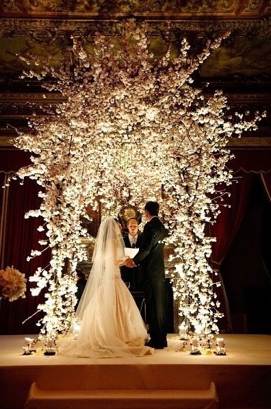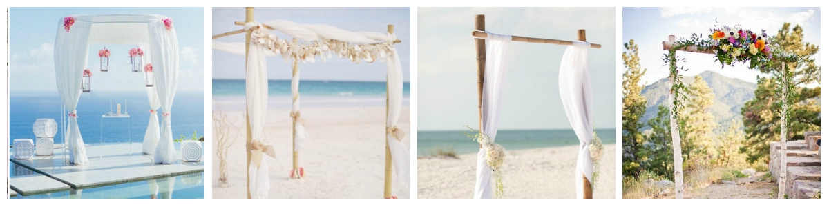 Arches and arbors have no specific religious meaning as the chuppah and are singular structures that a couple might stand in front of versus completely underneath. Arbors can be all different shapes and sizes and arches are typically rounded as shown in the pictures below. I have seen arches and arbors fashioned out of flowers or shells, wooden branches, twigs and material hung over tree branches.