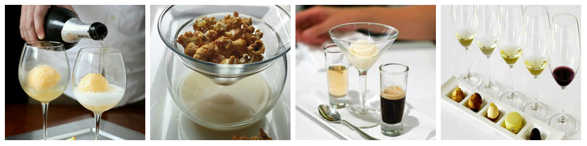 Take the pairings one step further and repeat for dessert! Pictured below are orange sorbet with champagne, caramel popcorn with vodka shots, one of my personal favorites is affogato, which is vanilla ice cream with frangelico liquor and espresso shots and last one is sweet dessert wine served with chocolates. One more yummy than the other.