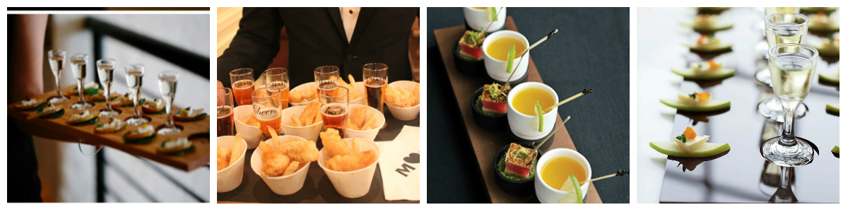 I have been looking around for inspiration for the next wedding we are both planning and catering and will share with you some fun beverage and appetizer pairings for cocktail hour and even for the main course that your guests will love! These appetizers are served a little differently than what we are used to seeing at events and this will work well whether you are having a formal black tie or casual backyard event. In fact imagine inviting your guests to a black tie wedding and then giving them fish and chips wrapped in paper with mini beer shots! So far we have had rave reviews.