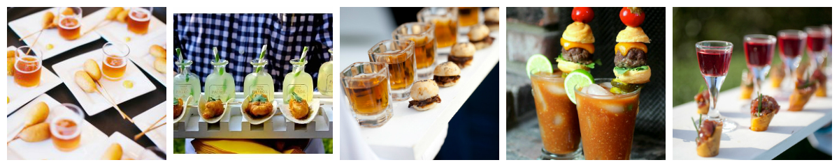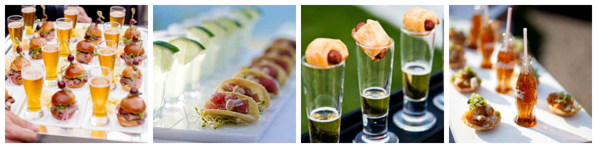More appetizer pairings below from left to right are corn dogs and beer shots, mini margaritas served in a patron bottle with tacos, bourbon shots with short ribs, hamburger sliders with bloody mary’s (how cute are those) and pot roast with chianti. There are so many options but don’t forget your guests who don’t drink alcohol. You can do mini sliders with cherry coke or fried chicken with sweet tea as well. So many fun combos for everyone and the mini glasses or bottles makes it so cool! You can even showcase your signature drinks paired with your favorite appetizer (the bloody mary and slider was the signature pairing at the last wedding we catered) and on the label of the little bottle or glass you can add the couple’s names with their wedding hashtag or for a fundraising event you can add a label with the name of your cause or foundation. These little bottles or shot glasses can also double as favors at a wedding.