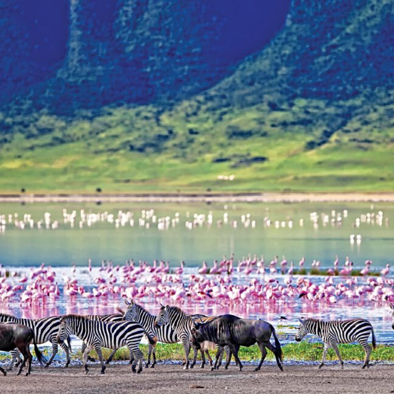 If the migration is not of interest to you, there is the hauntingly beautiful Serengeti in Tanzania known for its geographic wonders and vast wilderness areas. The plains of Serengeti National Park, known as the land of the “Big Five” is absolutely a “must see.” Kilimanjaro National Park claims Africa’s highest mountain and vistas of truly impossible beauty. You could explore both these Countries on an overland Kenya/Tanzania safari, witnessing wildebeest, zebra, and a host of other wildlife. One could start this adventure in Nairobi, and then travel to the Mount Kenya region, which is an extinct volcano, the highest mountain in Kenya, and the second highest in Africa, after Kilimanjaro. Abundant wildlife and over 130 bird species will have you enthralled and in safari “heaven.” Crowds of flamingos famously line the shores of several lakes and are often joined by other larger wildlife attracted to the cooling breezes of the lakes.