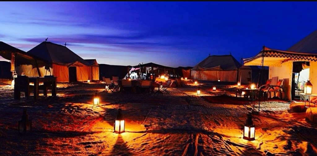 When you head just few hours out of Marrakesh, and you’ll find a completely different landscape. South of the High Atlas Mountains, this sun-kissed stretch of dusty desert is broken up by sand-colored kasbahs and palm-fringed fortified villages. On the Western side of the High Atlas Mountain, there is Kasbah Tamadot which is a retreat belonging to Sir Richard Branson and quite stunning. When you get closer to the desert on the Eastern side of the same range you will find Kasbah Dar Ahlam and you can choose to stay in the Kasbah (which is a renovated fortress) or one of their luxury tents and enjoy a romantic dinner set up in the middle of an oasis. Dar Ahlam means Home of Dreams.