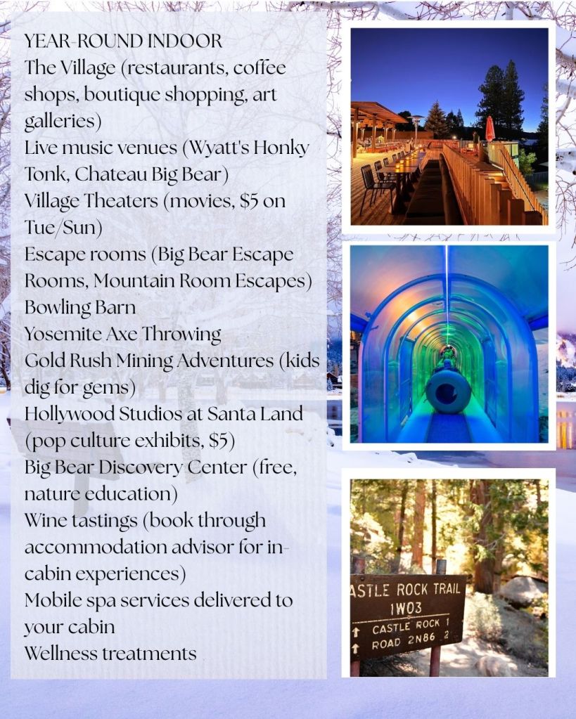 - A variety of activities throughout Big Bear for those who don’t ski or those low/no ski days. Scroll down for a list.
